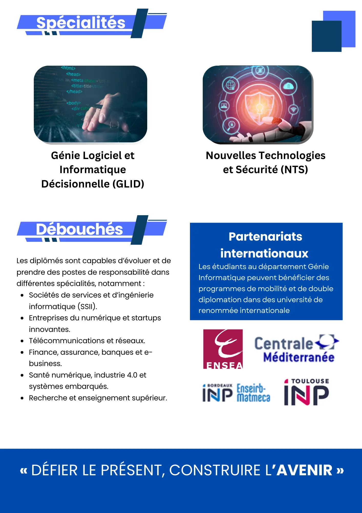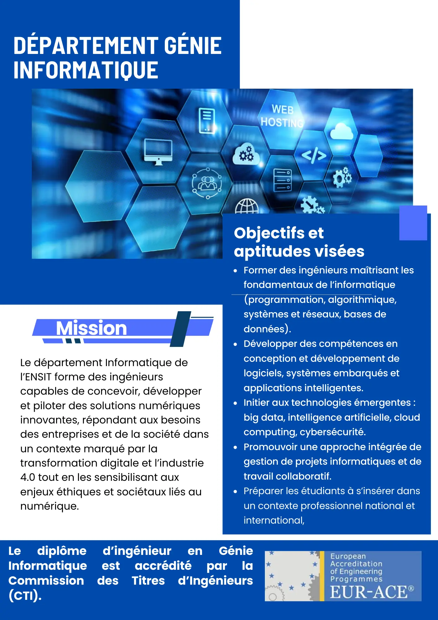 La formation d’ingénieur en Génie Informatique de l’ENSIT vise à former des ingénieurs capables de concevoir, développer, déployer et sécuriser des systèmes informatiques modernes, en couvrant tout le cycle de vie des logiciels et des infrastructures numériques. Elle prépare les diplômés à maîtriser la programmation avancée, la conception de logiciels, les architectures et systèmes, les réseaux, la sécurité, ainsi que l’exploitation et l’analyse des données pour la prise de décision.