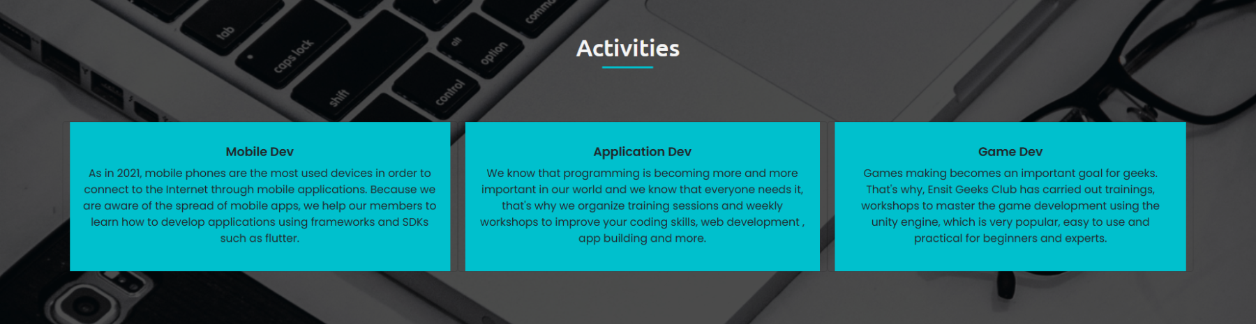 ENSIT Geeks Club was founded in 2021 by Nizar Essid at The Higher National School Of Engineering Of Tunis . It brings together people interested in sharing their knowledge and helping each other in IT. It welcomes both beginners and experts. It aims to deepen your knowledge necessary in IT to be able to succeed in the professional field and allow students to use today's technology to prepare for the future