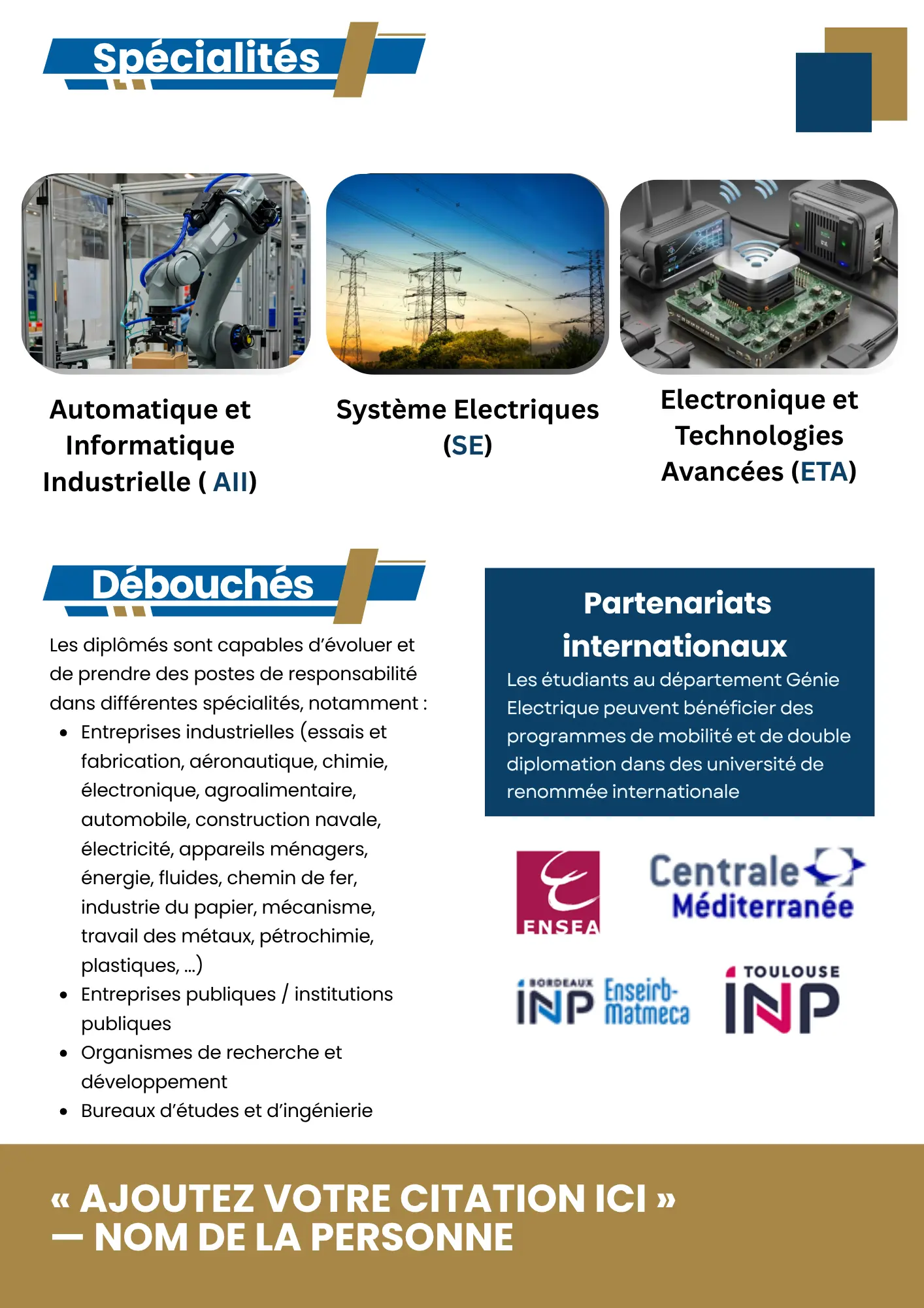 Elle permet d'acquérir des compétences en électrotechnique, électronique de puissance, automatismes, robotique, systèmes embarqués, systèmes électriques et énergies renouvelables, tout en développant des aptitudes en résolution de problèmes, gestion de projets, travail en équipe et communication professionnelle.