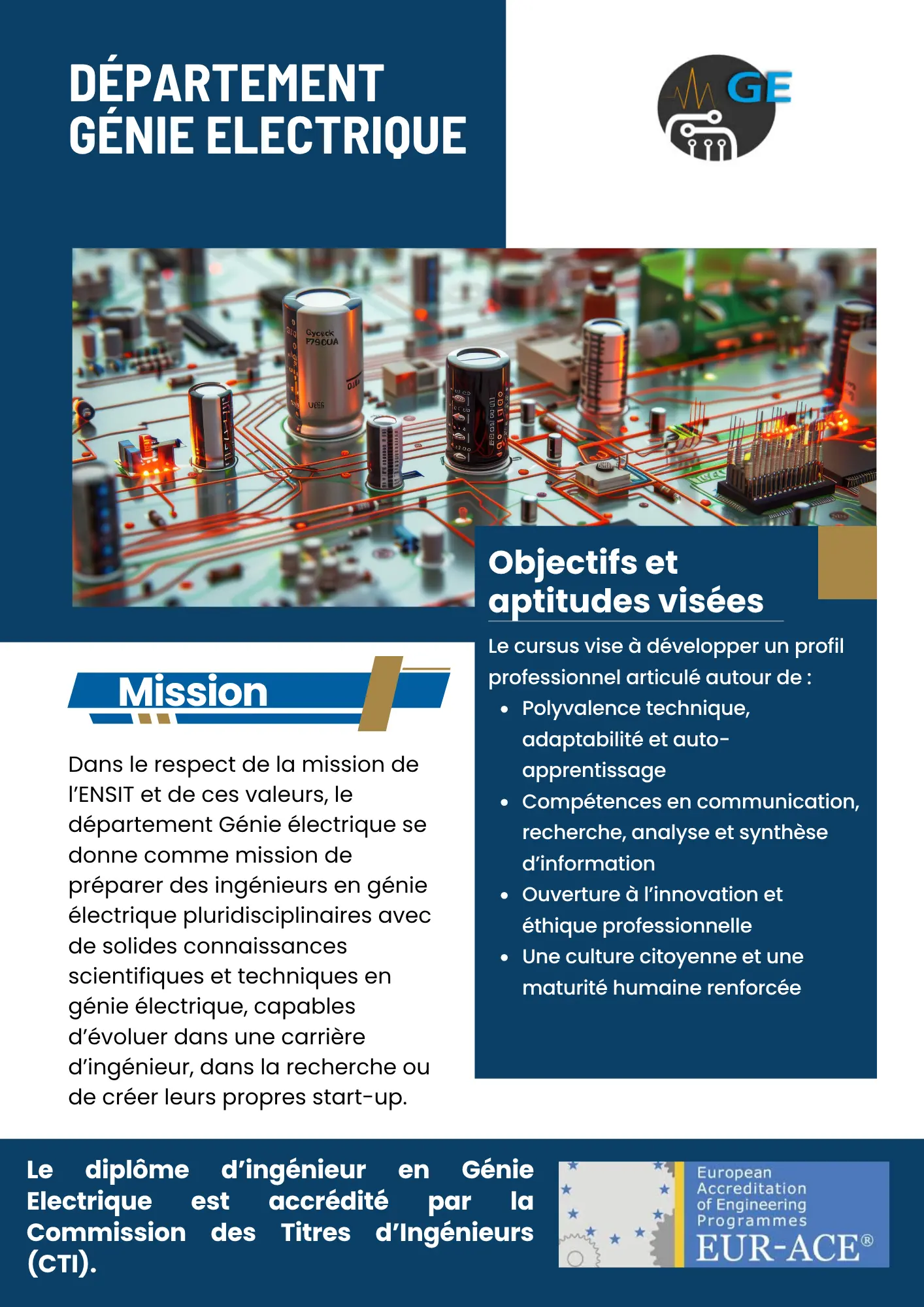 Il offre une formation complète en électronique, électrotechnique et électromagnétisme, automatique et systèmes de commande, traitement du signal et communication, ainsi qu'en énergie et machines électriques.