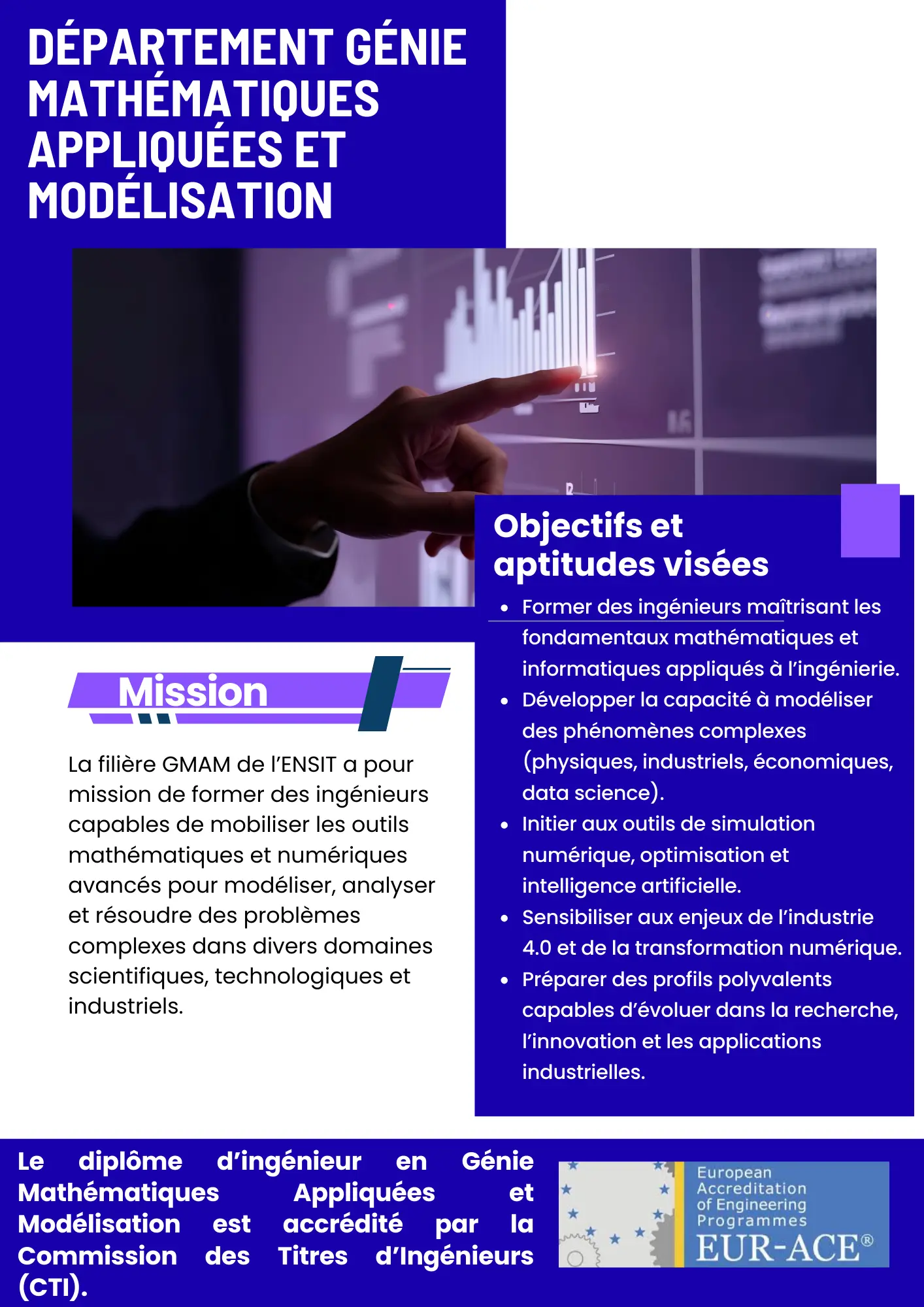 La formation vise à former des ingénieurs capables de modéliser, analyser et résoudre des problèmes complexes issus des systèmes industriels, technologiques et scientifiques, en s'appuyant sur les mathématiques appliquées, la modélisation, la simulation et les outils numériques avancés.
