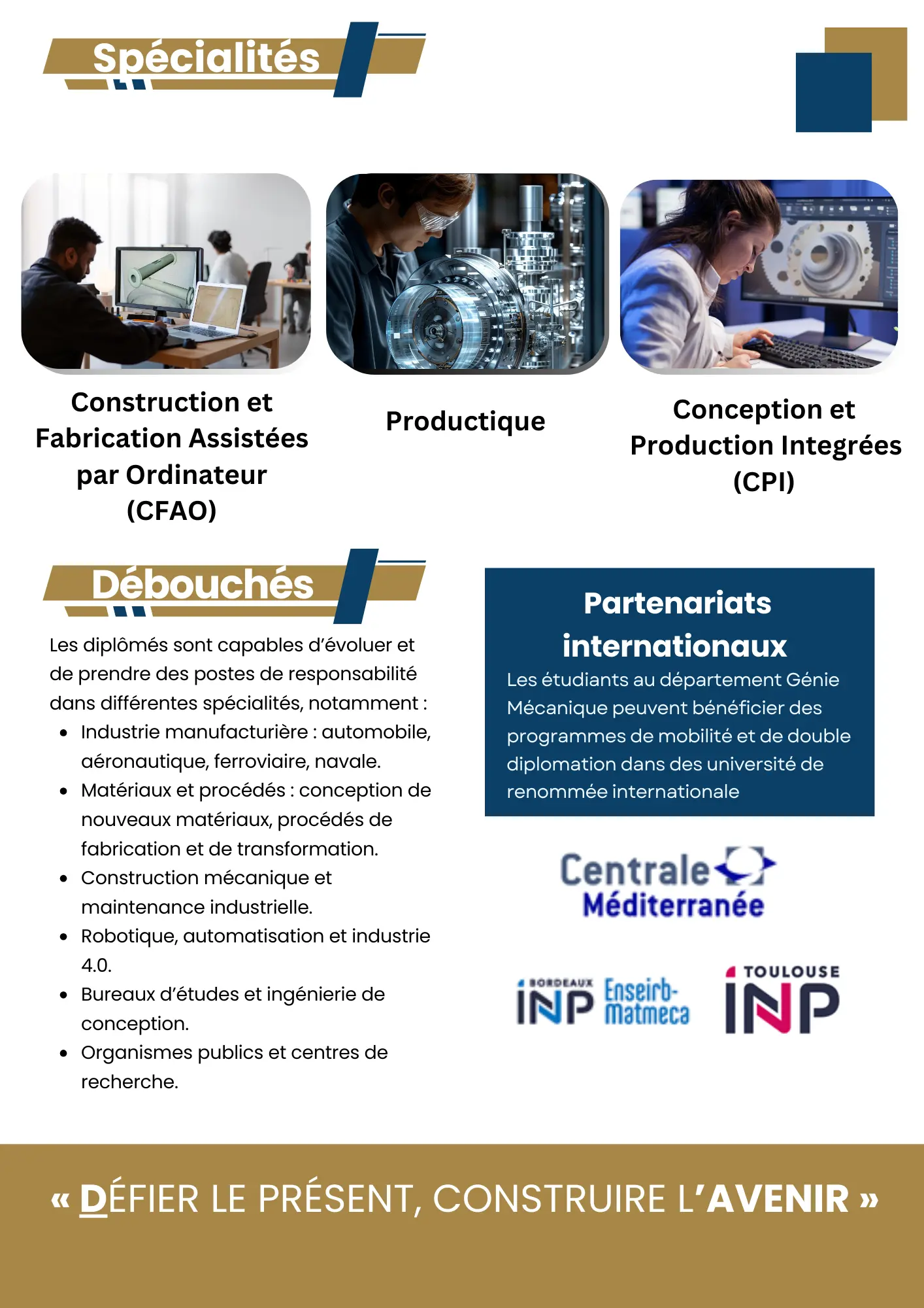 Il offre une formation complète en mécanique générale, mécanique des solides rigides, résistance des matériaux, dynamique et vibrations, mécanique des fluides, thermique, thermodynamique appliquée, fabrication industrielle et CAO/DAO.