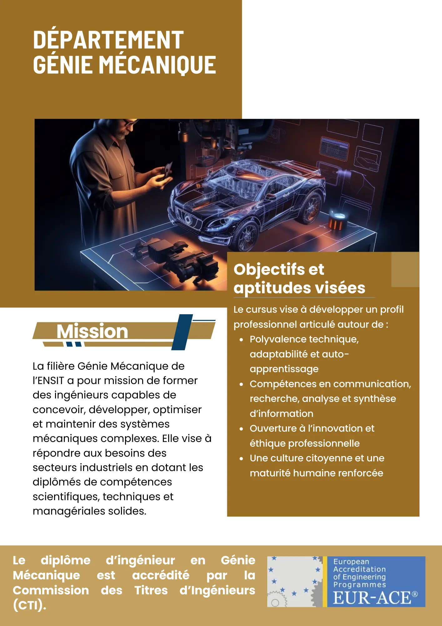La formation d'ingénieur en Génie Mécanique de l'ENSIT forme des ingénieurs capables de concevoir, analyser, dimensionner et optimiser des systèmes mécaniques, des structures et des procédés industriels répondant aux besoins de l'industrie manufacturière et aux enjeux de performance, de fiabilité et de durabilité.